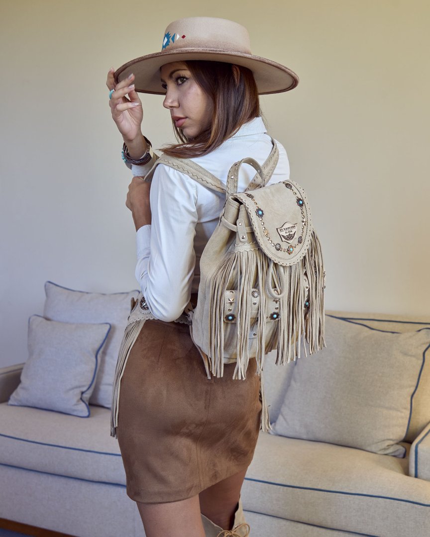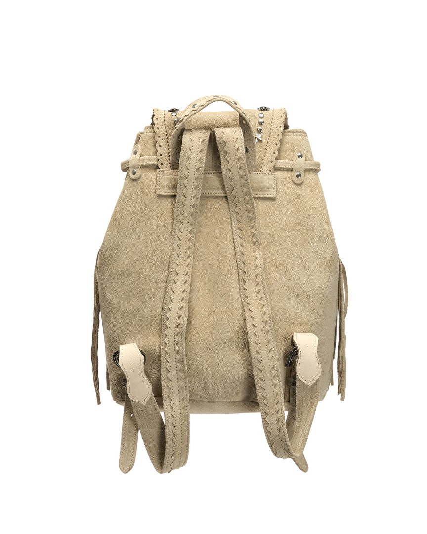 Our iconic backpack returns in an even more aggressive studded version: Alba. Handcrafted in Tuscany, with individually applied studs, it is an accessory that combines character and functionality. Long fringes, external pockets, internal zip pocket, metal details and magnetic closure make it practical and irresistible. Finished with the famous Silverstone wash, which enhances every nuance of the leather and makes each piece unique and unrepeatable.