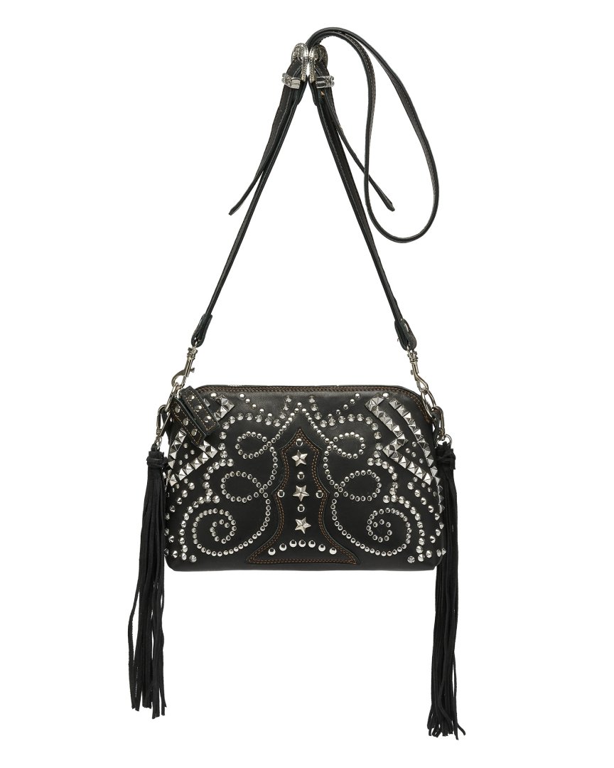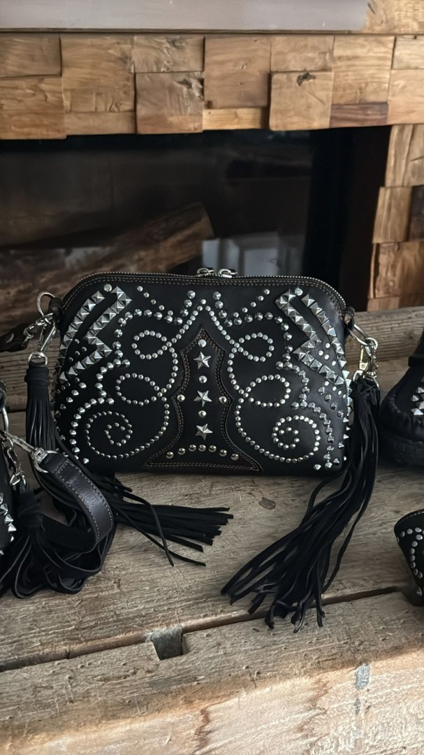 The Briony bag is handmade in Tuscany by our skilled artisans, using premium black leather. Each stud is applied by hand, forming an exclusive geometric pattern that makes this design truly distinctive. The side fringes bring a touch of movement and personality. A limited edition, every Briony bag is a one-of-a-kind piece.