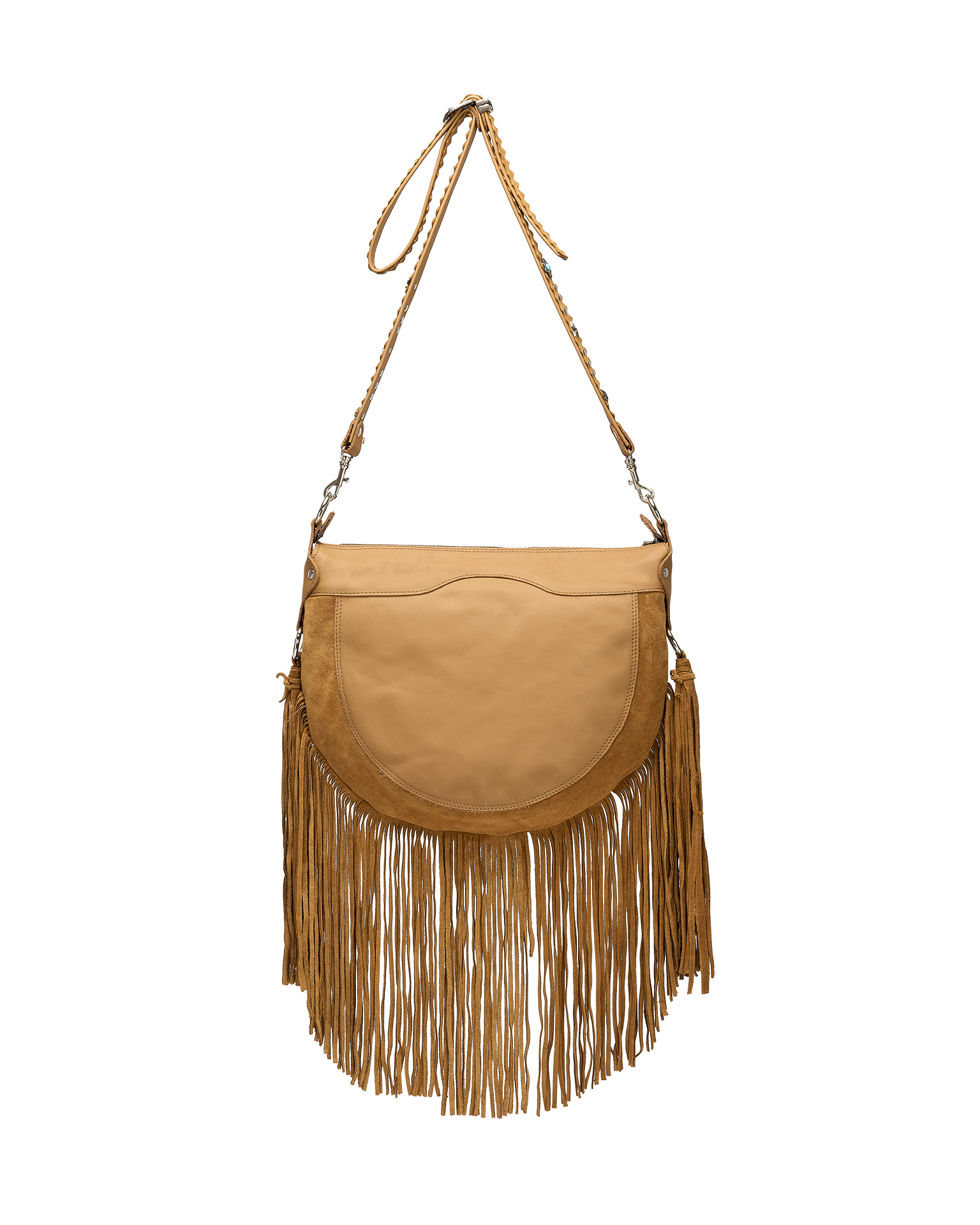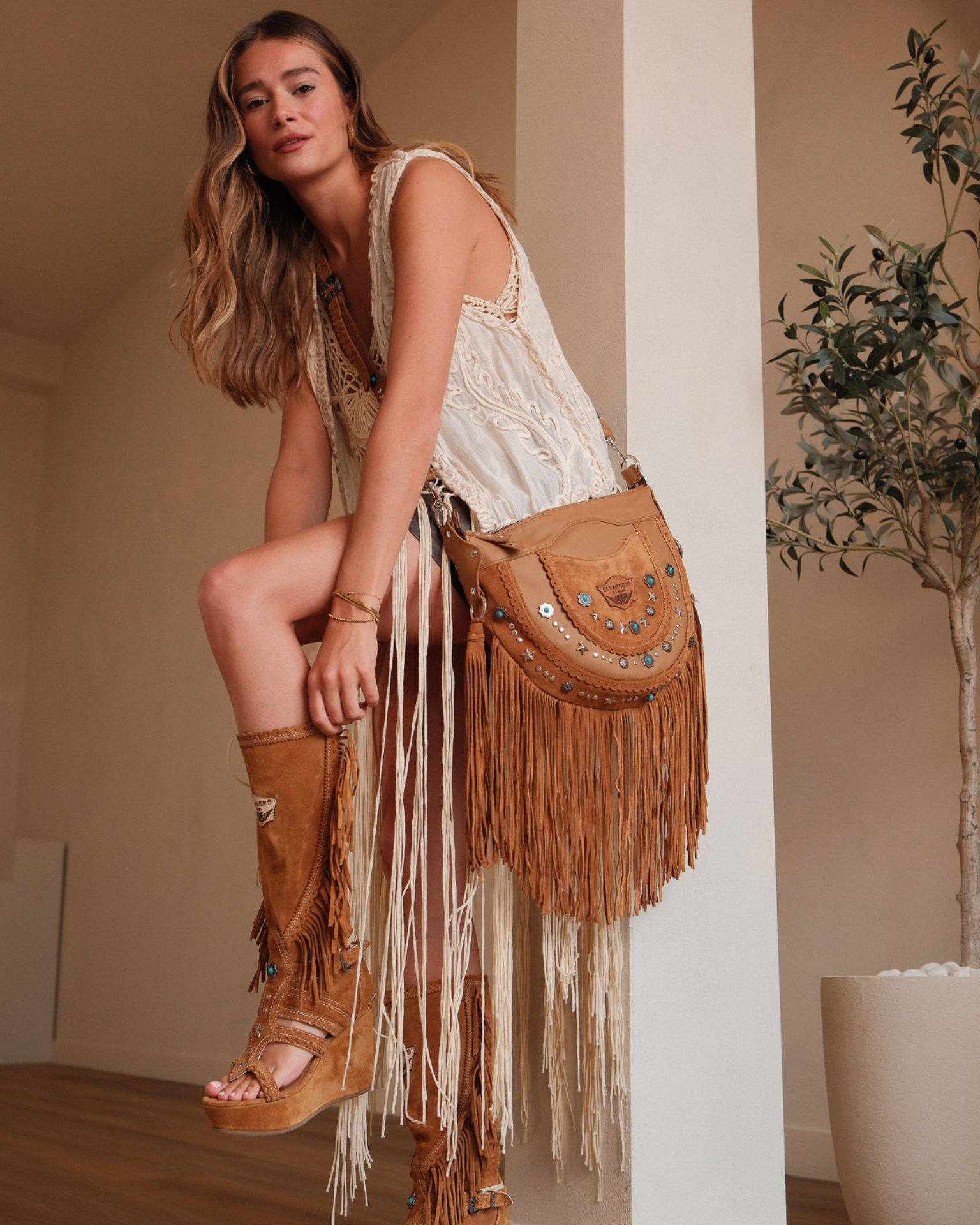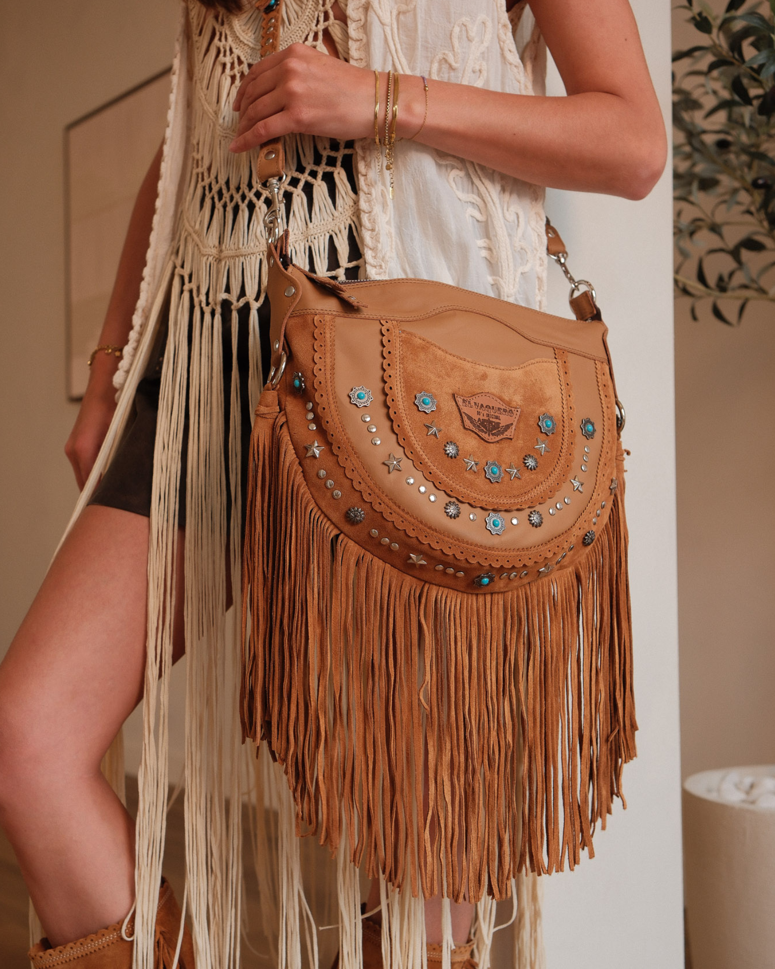 Hilary is El Vaquero’s messenger bag that fuses rebellious spirit with Tuscan craftsmanship. Handmade in Tuscany from a refined mix of smooth leather and suede calfskin, it’s adorned with individually hand-applied studs. Featuring a comfortable leather shoulder strap, zip closure, and long fringes, it’s the ideal piece for those who want bold style with artisanal soul.