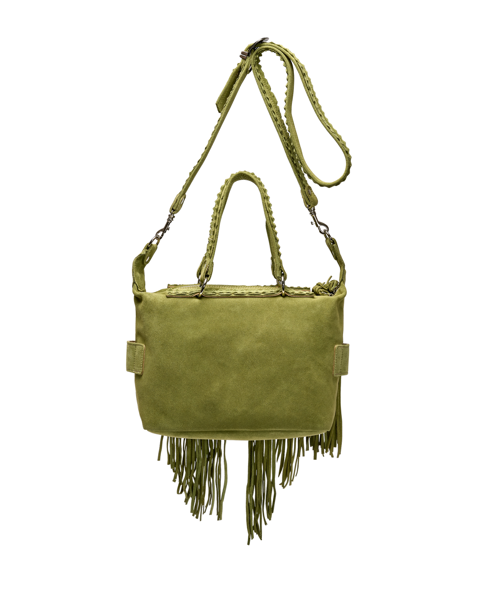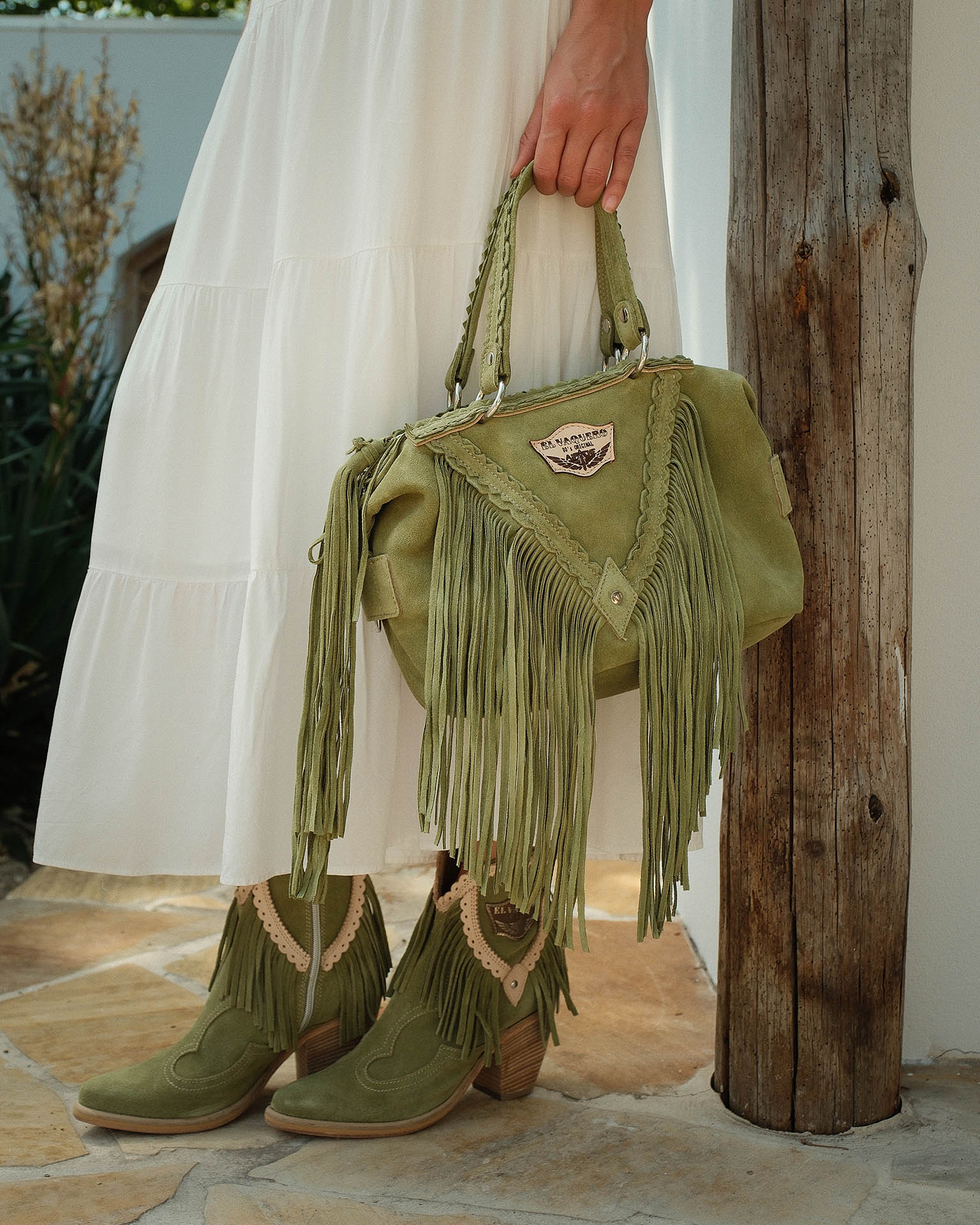 Byron is El Vaquero’s new handbag—small yet surprisingly spacious, perfect for both daytime and evening looks. Decorated with long fringes, fine leather detailing, and metallic accents, it undergoes our signature Silverstone ageing treatment, creating rich tonal variations and unique color effects on the suede that define the one-of-a-kind character of each piece.